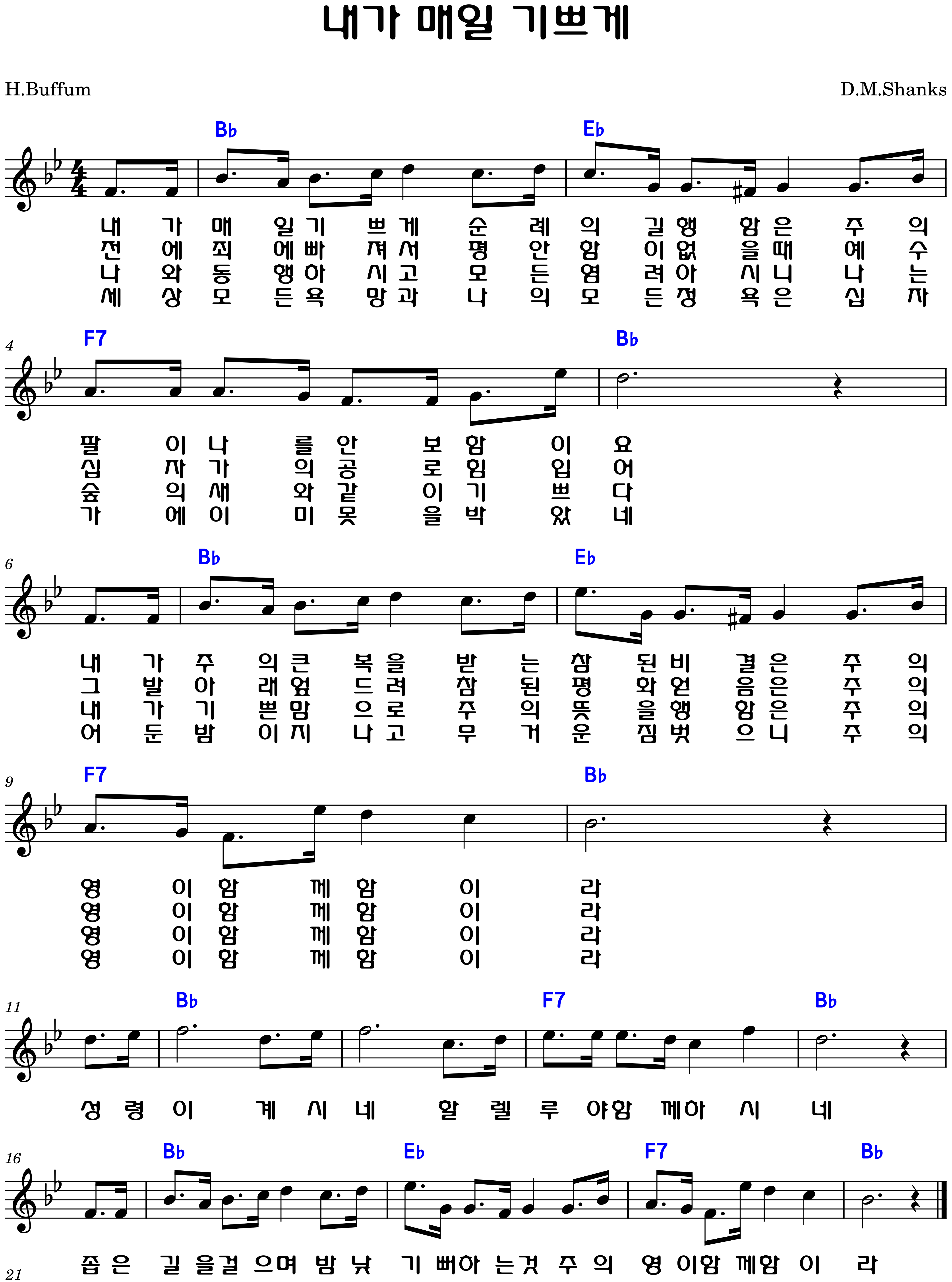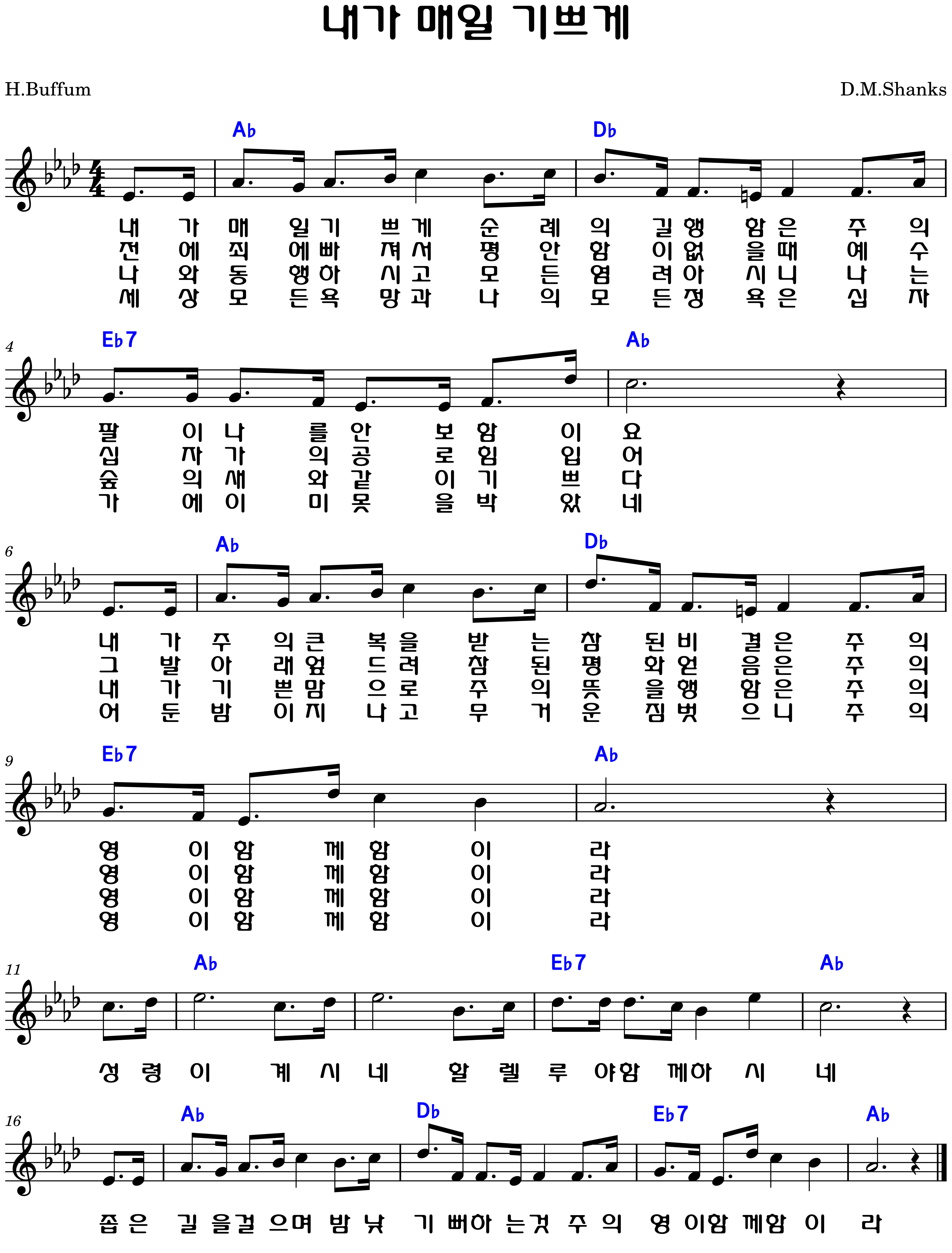 “내가 매일 기쁘게 순례의 길 행함은 / 주의 팔이 나를 안보함이요 / 내가 주의 큰 복을 받는 참된 비결은 / 주의 영이 함께 함이라”