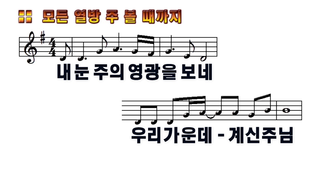 -하나님의 영광을 선포하는 찬양으로, "내 눈 주의 영광을 보네" 와 잘 어울립니다.
