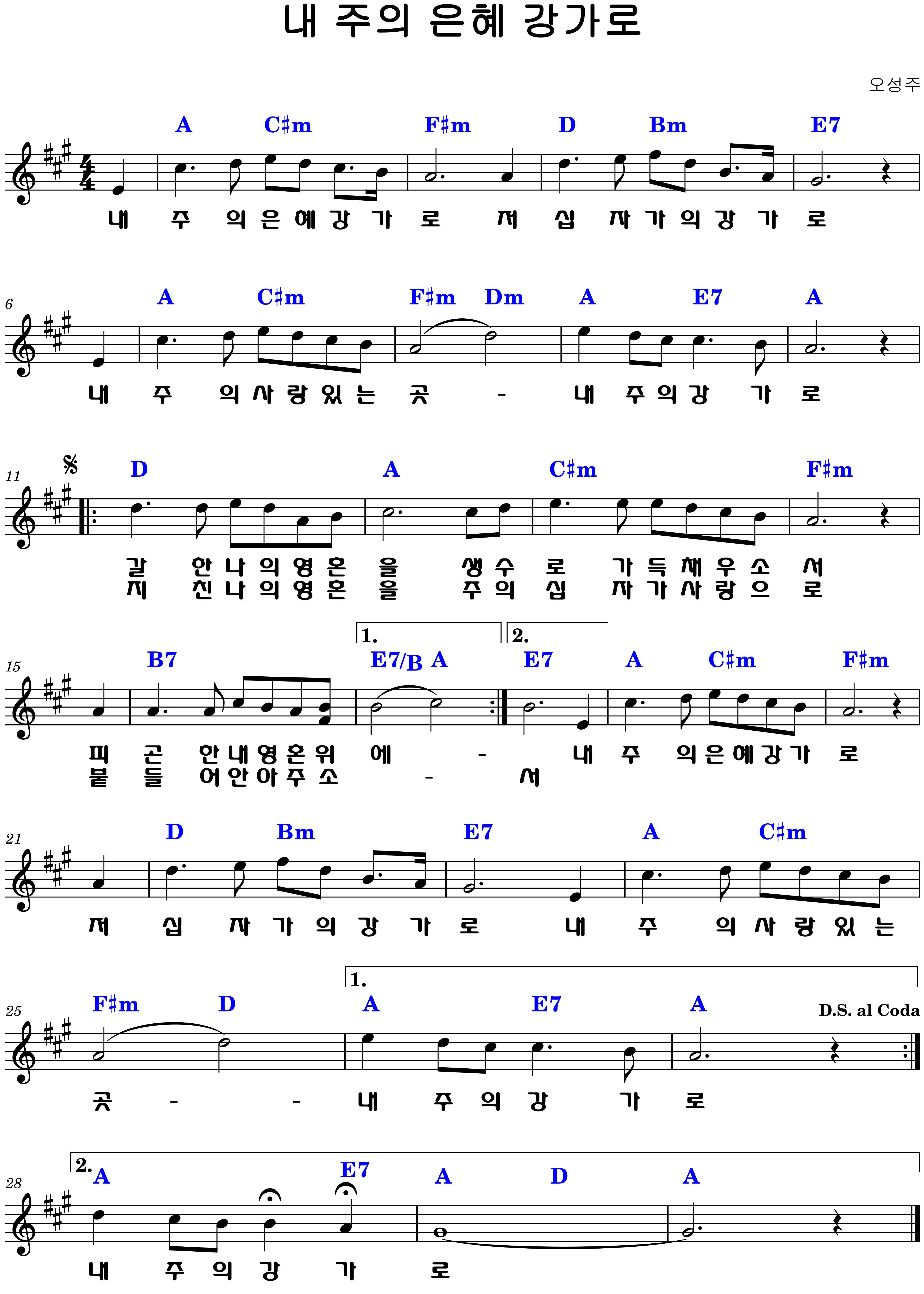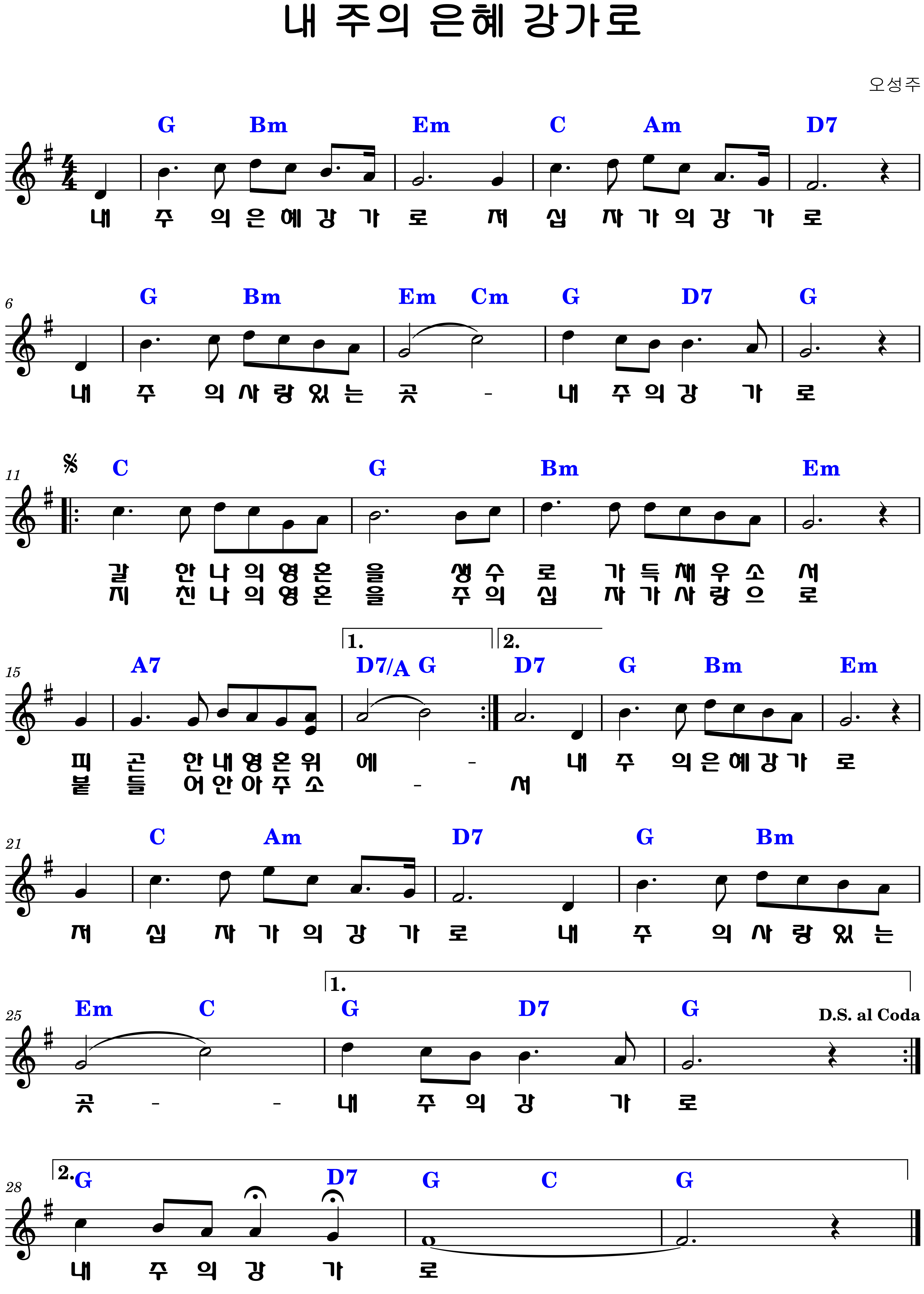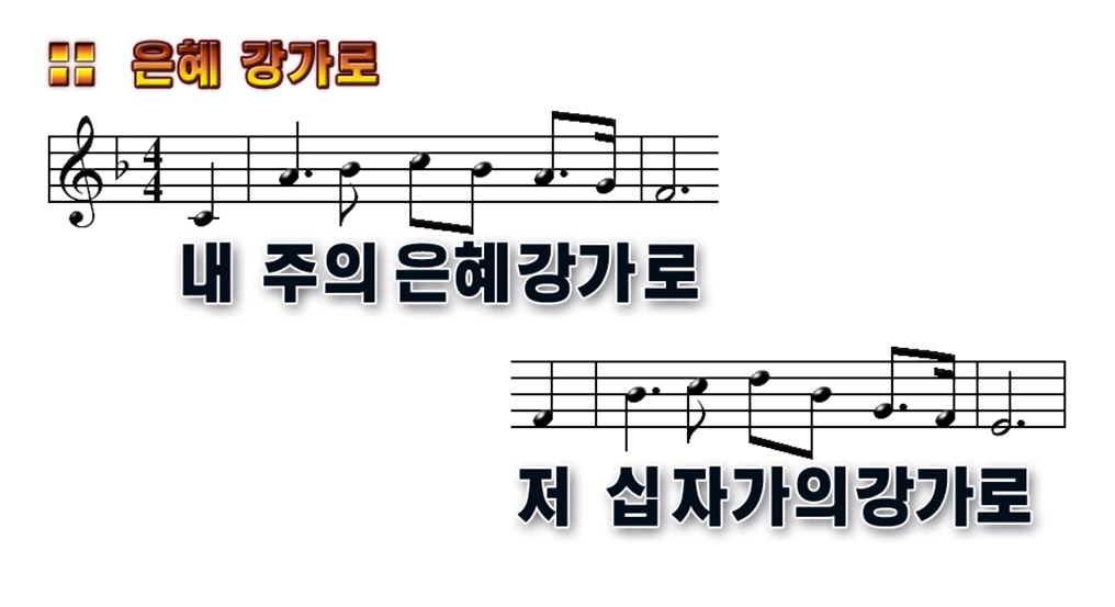 "내 주의 은혜 강가로 / 저 십자가의 강가로 / 내 주의 사랑 있는 곳 / 내 주의 강가로"