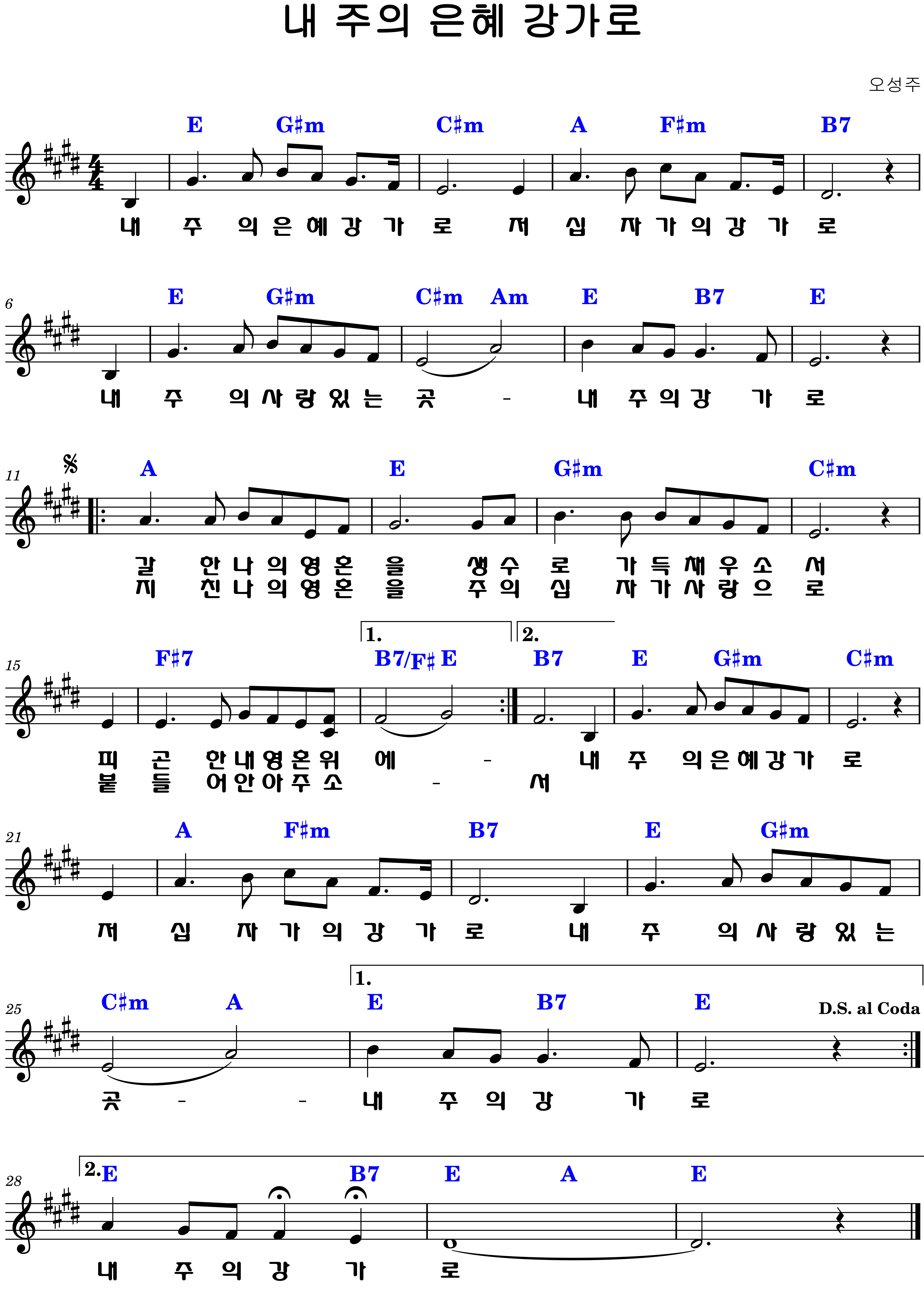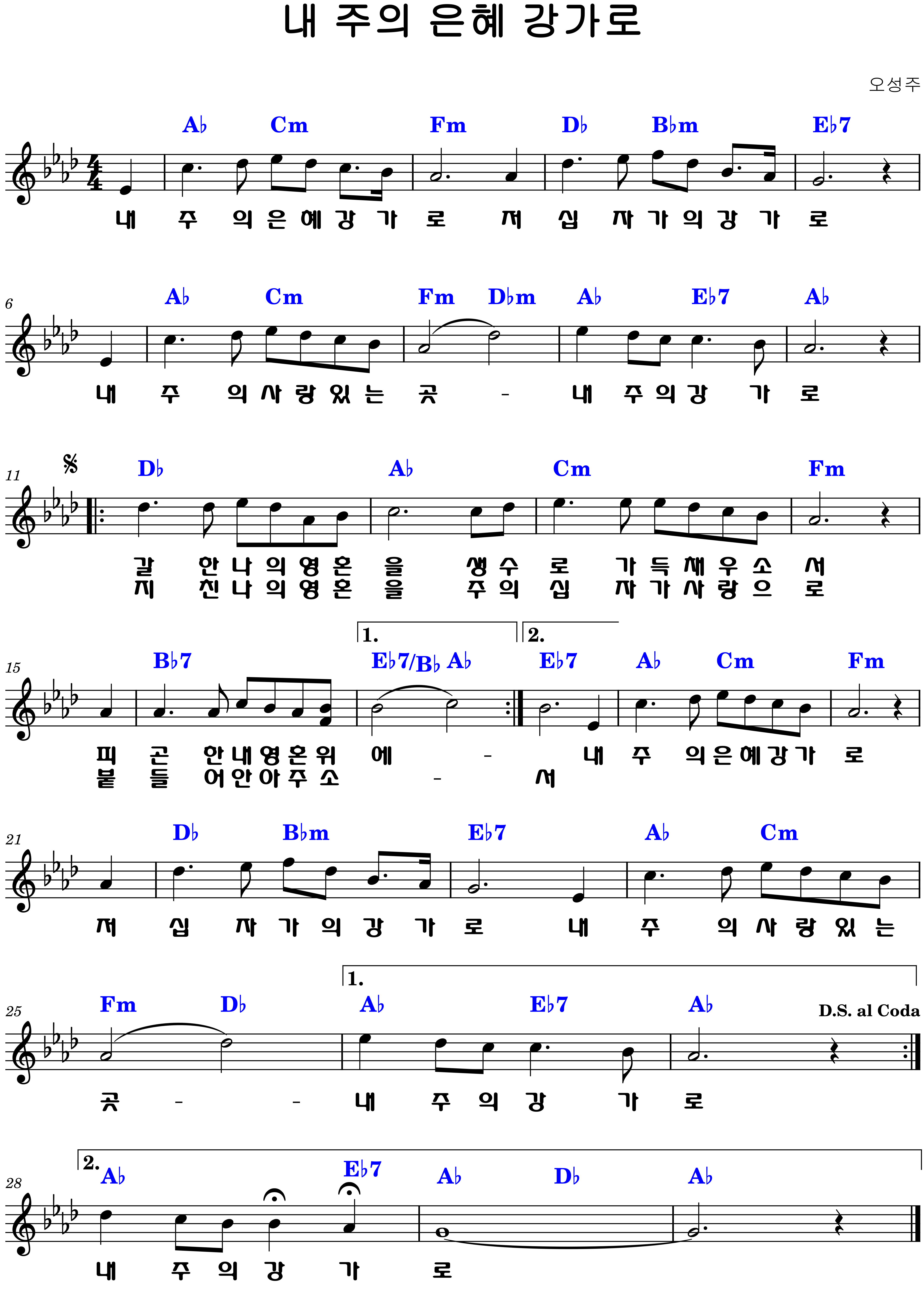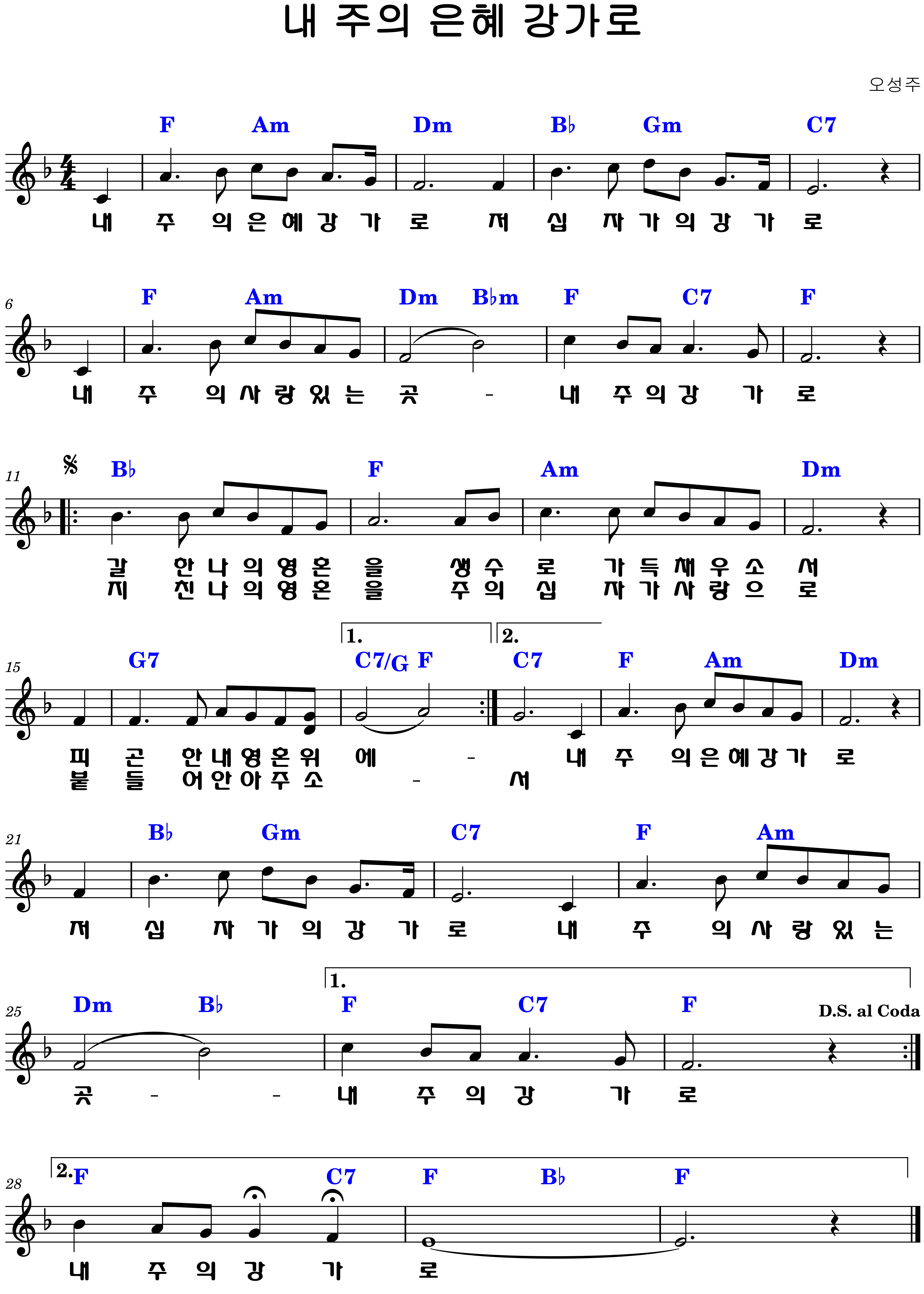 "내 주의 은혜 강가로 / 저 십자가의 강가로 / 내 주의 사랑 있는 곳 / 내 주의 강가로"
