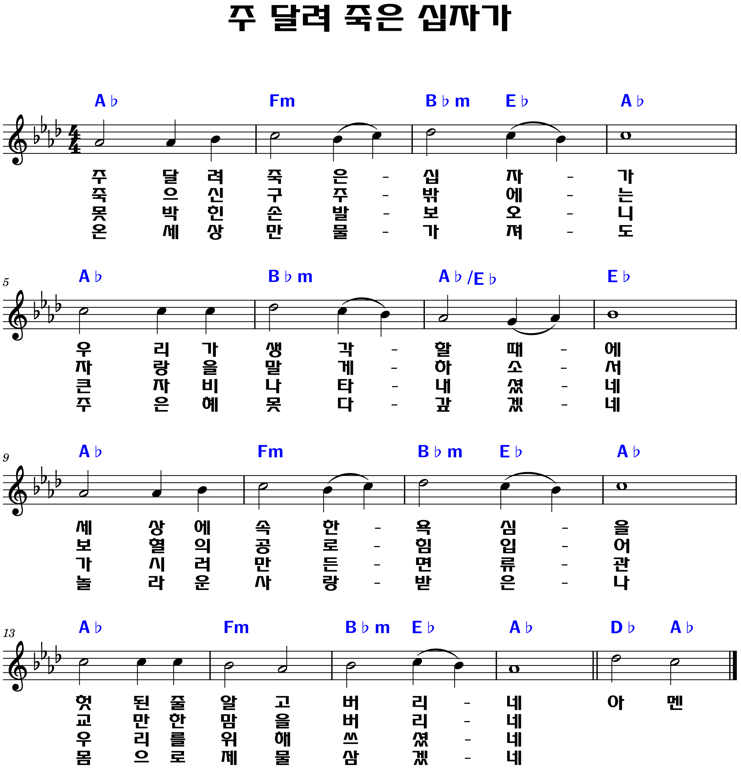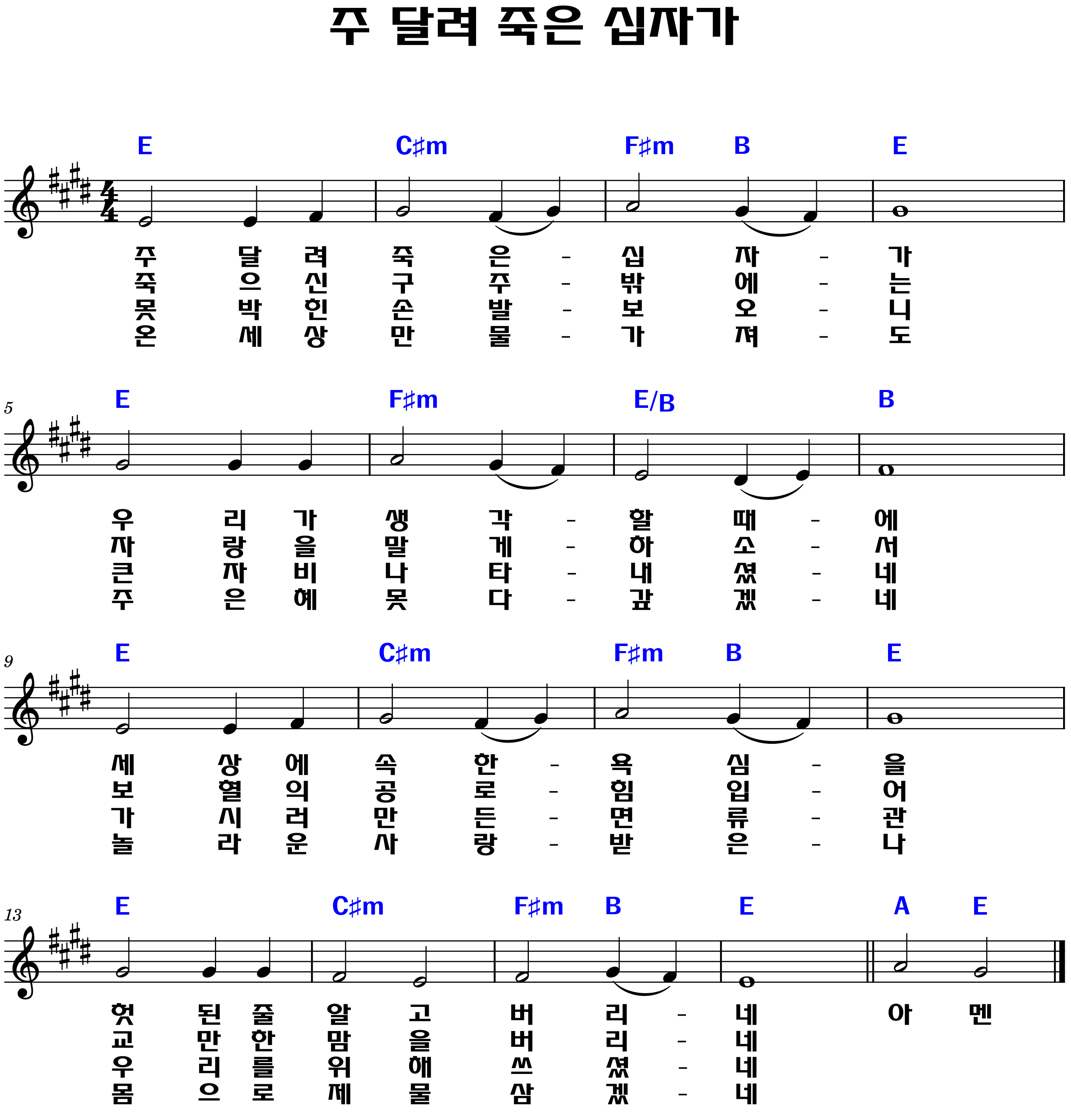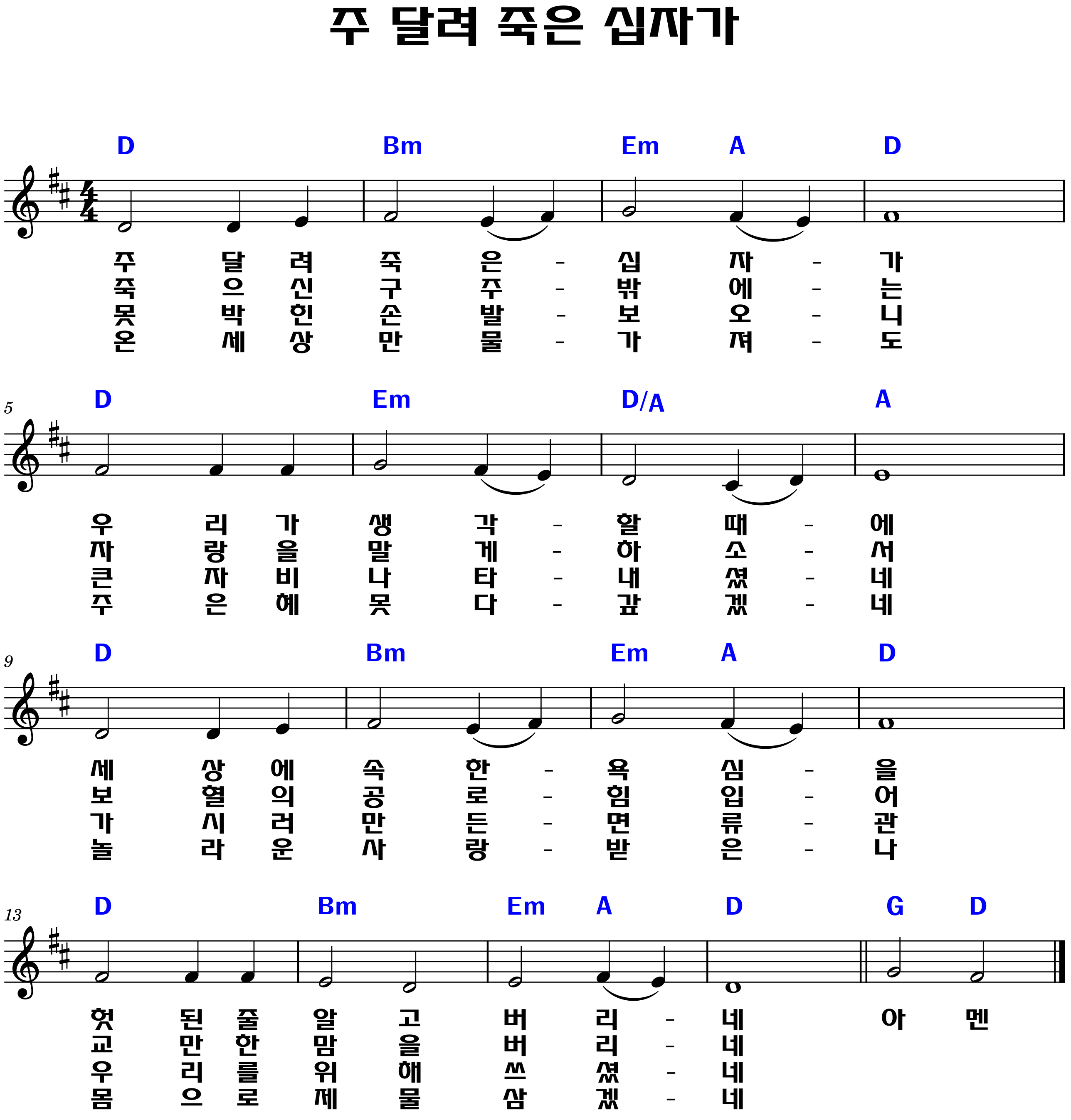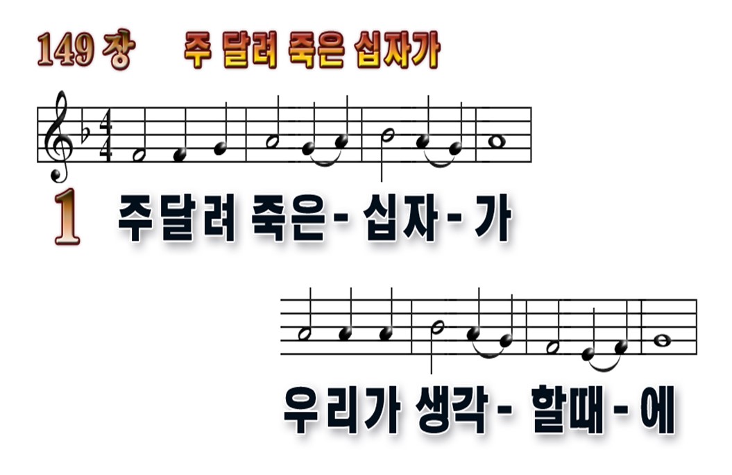 "못 박힌 손 발 보오니 / 큰 자비 나타내셨네 / 가시로 만든 면류관 / 우리를 위해 쓰셨네"