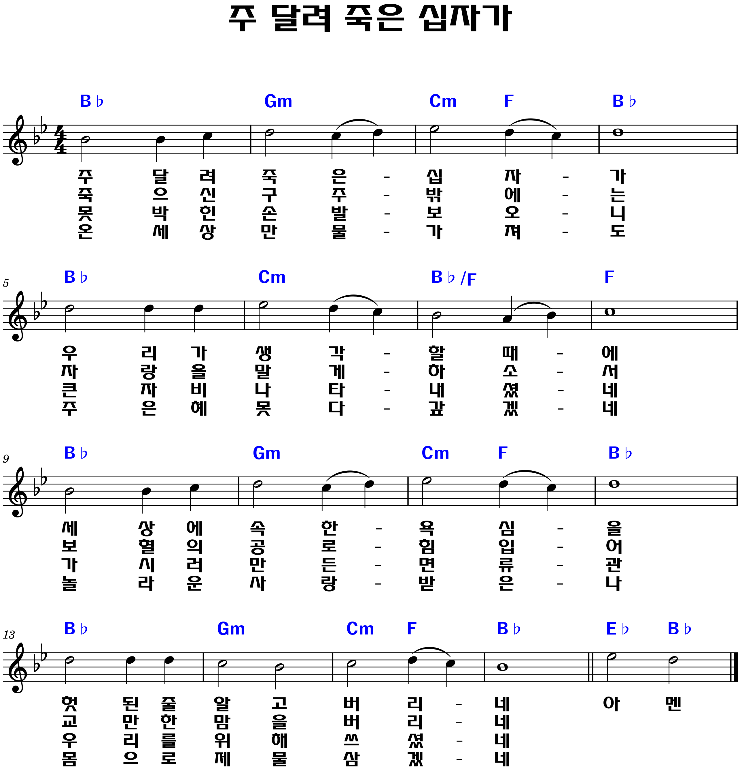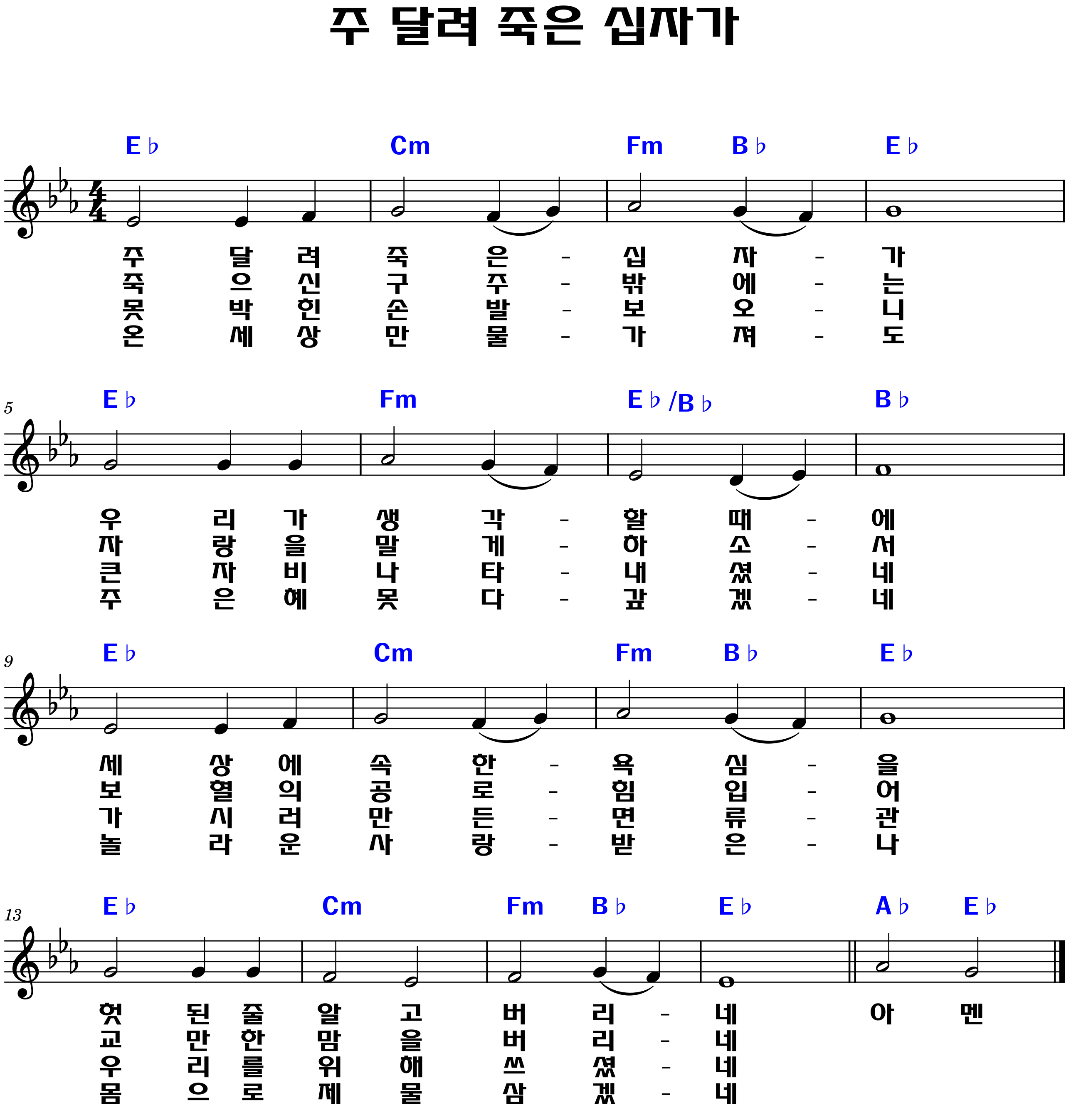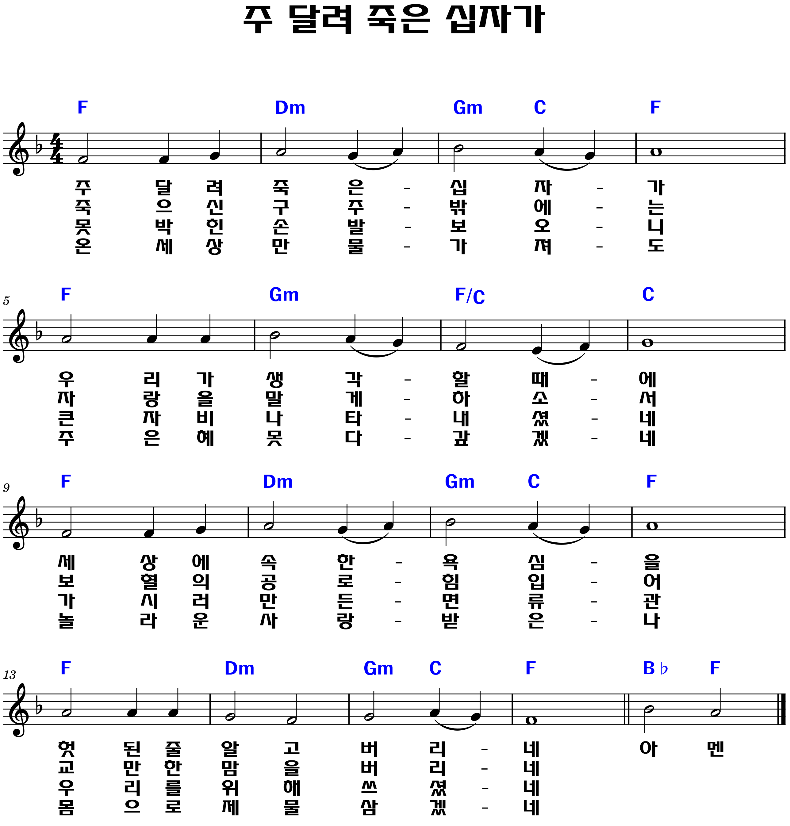 "못 박힌 손 발 보오니 / 큰 자비 나타내셨네 / 가시로 만든 면류관 / 우리를 위해 쓰셨네"